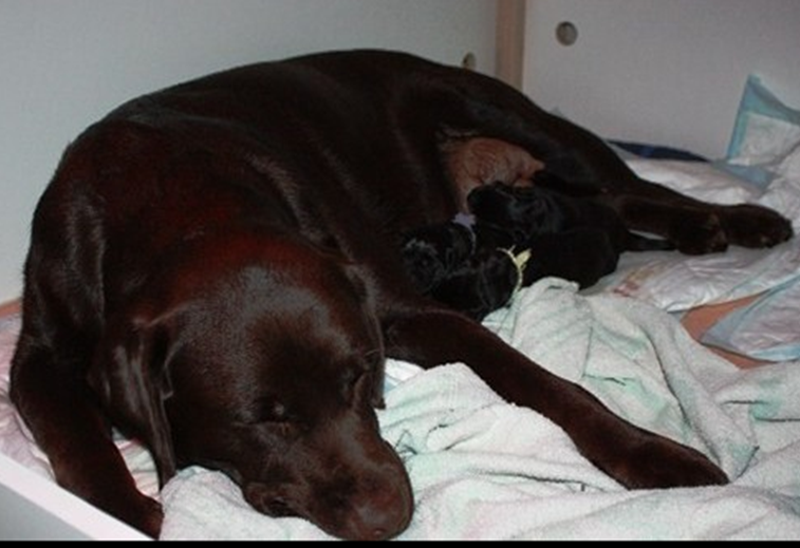 Die Geburt verlief toll, es schien fast so als ob Bounty die Wehen einfach so weg steckte. Als erste kam die Hündin um 21.12 zur Welt, anschließend folgten die Rüden um 22.00 und um 23.38. Bounty kümmert sich liebevoll um ihre Babys und lässt sie keinen Augenblick aus den Augen. Ich bin sehr, sehr stolz auf meine Hexe.